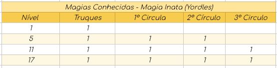 ∆ Magia Inata; Yordles conhecem naturalmente algumas magias da lista de Magias Yordle. Eles não requerem componentes material para essas magias. Sempre que uma magia inata Yordle é conjurada, ela pode causar um efeito aleatório. No momento que você utilizar uma magia o Mestre deve rolar 1d100, com o resultado, terá o efeito de sua Magia Descontrolada. Consulte a Tabela de Magias Conhecidas dos Yordles, e adicione as suas magias: